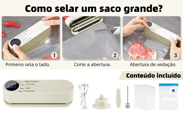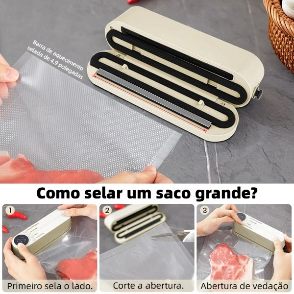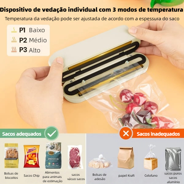 Sucção forte, vedação rápida e firme. Gosto da temperatura ajustável e da tela LED para fácil operação. Ideal para manter a comida fresca!