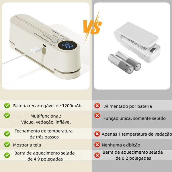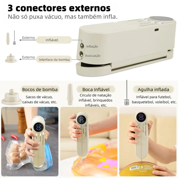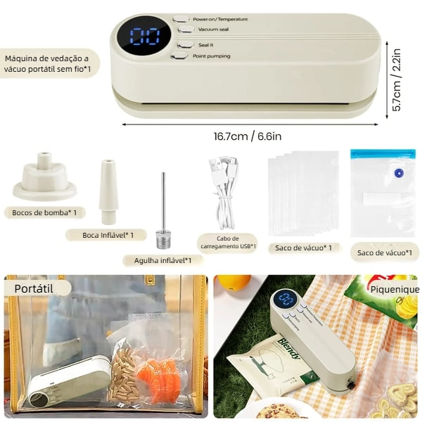 Seale rapidamente os alimentos para evitar desperdícios e até mesmo inflar as bolas desportivas. Design sem fio e duração ultra-longa, ideal para cozinha e viagens ao ar livre. Fortemente recomendado!