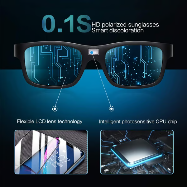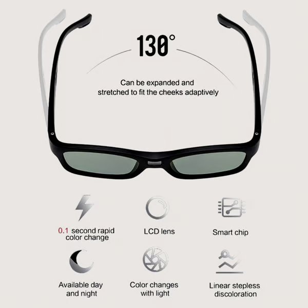 【Smart Light Control】This smart photochromic sunglasses are equipped with new liquid crystal dimming lenses, clear and natural vision, combined with polarized lenses with 99% blocking efficiency, can effectively filter the glare, glare, to achieve a more comprehensive and effective eye protection.