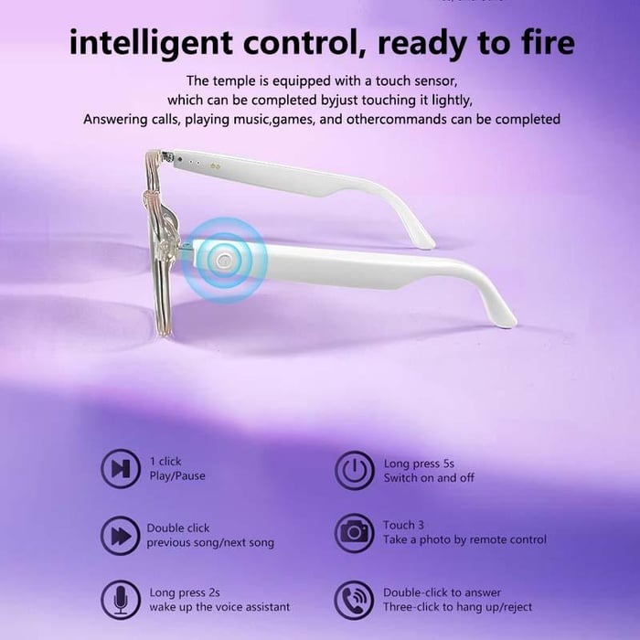 The temples have touch sensors for easy commands: one tap to answer/end calls or play/pause music; two taps to switch songs or adjust volume; Press and hold the left red line or the right red line for two seconds to wake up the voice assistant, touch and click to close the voice assistant; four taps to switch languages.